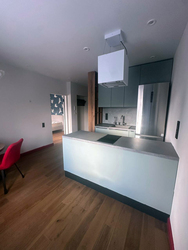 В квартире интересная планировка: большие окна, островная кухня, стол вдоль всего окна, отдельная гардеробная комната. Квартира хорошо укомплектована техникой: кухня-встроенными микроволновкой, плитой, посудомоечной машиной, большой холодильник, в ванной стиральная машина с сушкой. На случай отключения горячей воды есть водонагреватель, кондиционеры стоят на кухне и в комнате. Есть большая двухспальная кровать и диван.